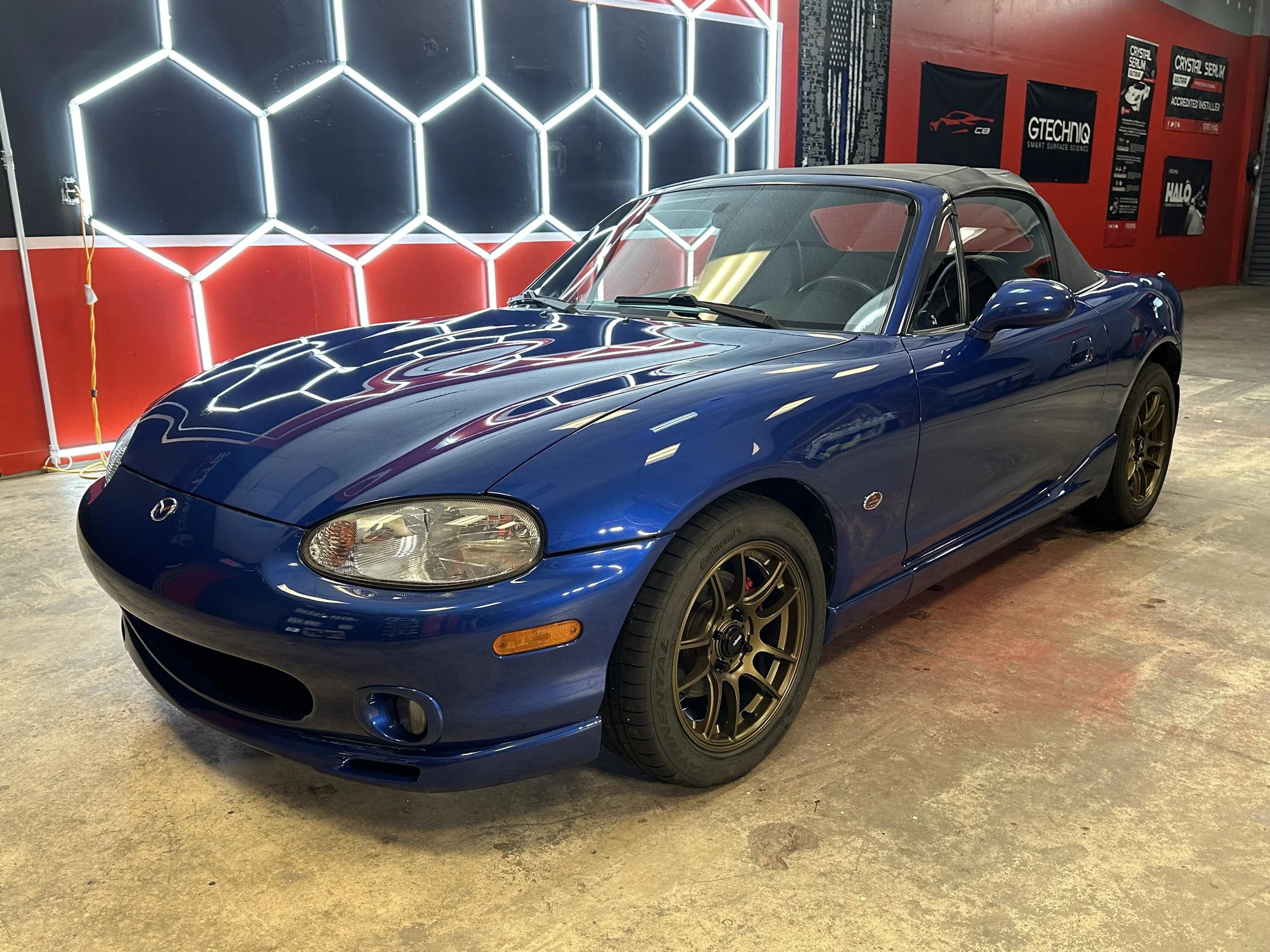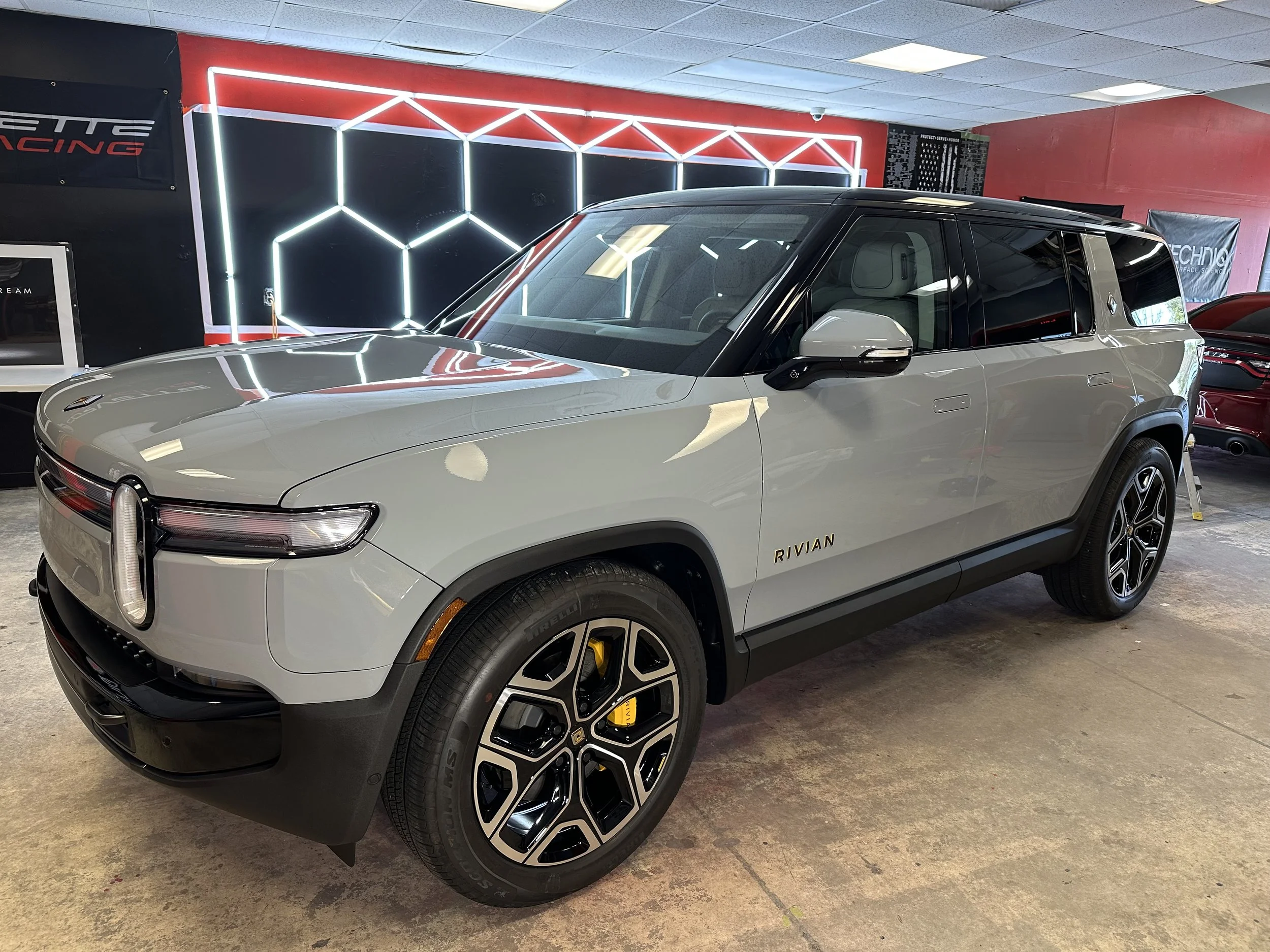 Exterior-vehicle wash prep, pre rinse, foam wash, clay bar, decontamination wheels/paint using soft water, engine compartment cleaned, GTECHNIQ C2V3 spray application ceramic sealant added to the paint for a 6 month protection, tires matte.